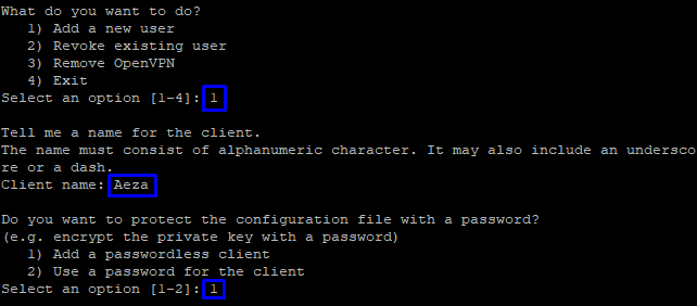 - Цифру 1 для создания клиента без пароля (либо 2 для входа в ВПН по паролю).