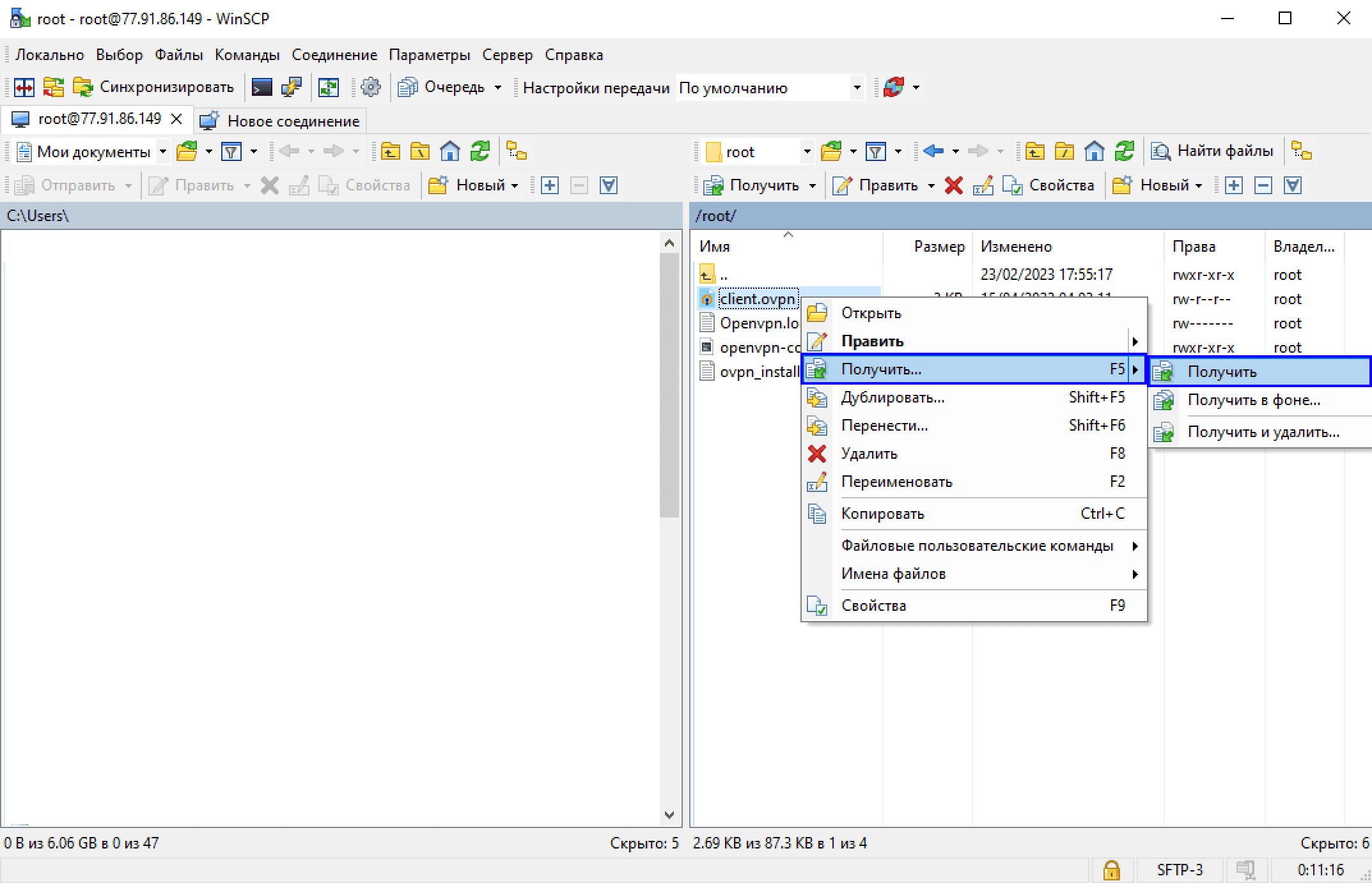 После подключения кликаем по файлу client.ovpn и нажимаем F5, либо кликаем по нему правой кнопкой мыши и загружаем его кнопаками «получить»: