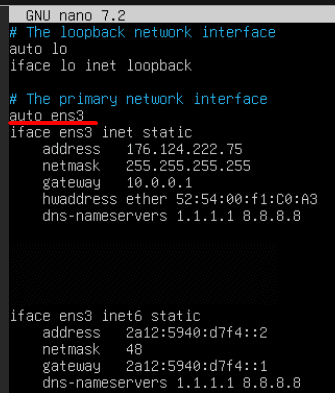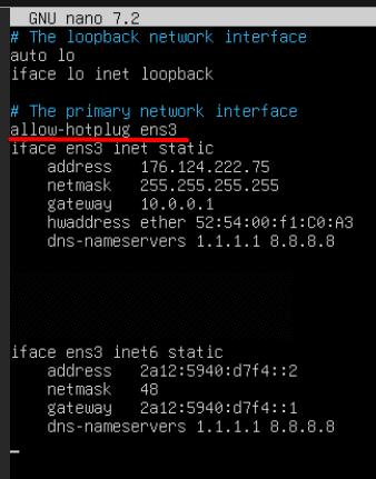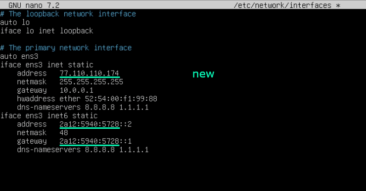 Заменяем IPv6 адрес и IPv6 gateway на новый (стандартный адрес оканчивается на ::2, любой ipv6 шлюз оканчивается на ::1, нужно заменить только номер подсети).