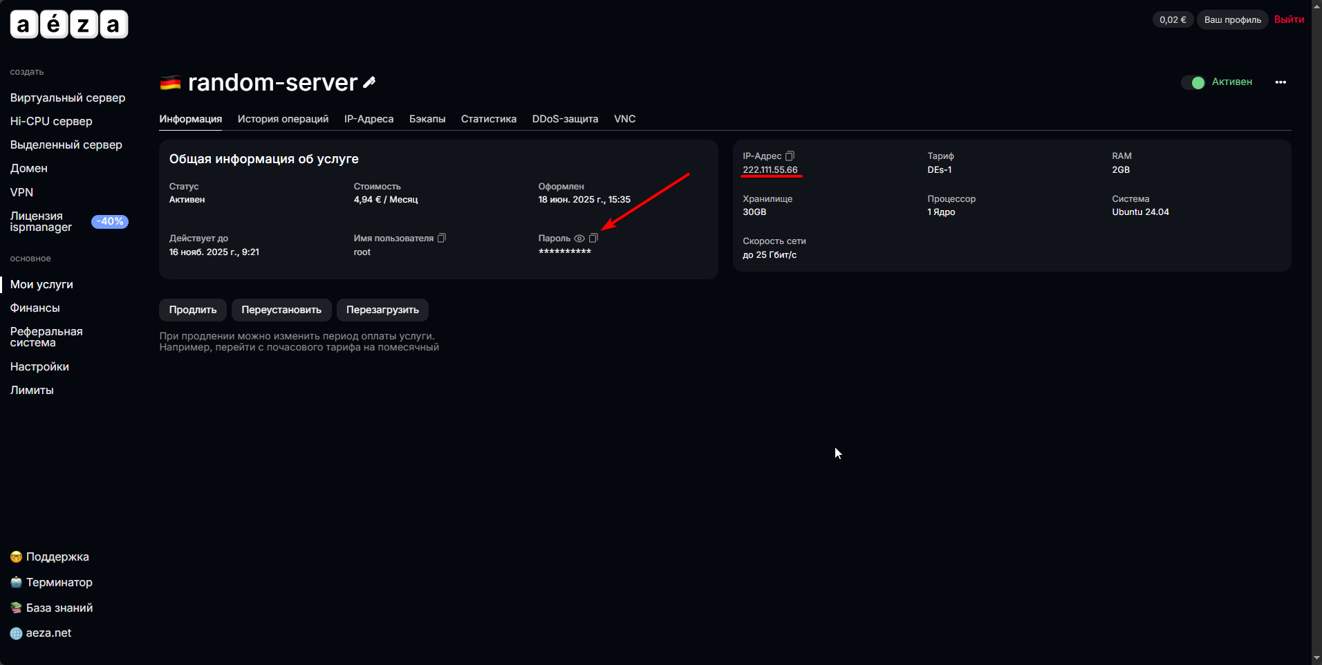 Также понадобится IP адрес и пароль от root аккаунта вашего сервера, в случае Aéza это можно сделать зайдя на страницу услуги и скопировать их.